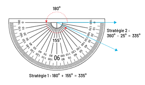 rapporteur est écrit: stratégie un: 180 degrés plus 155 degrés égale à 335 degrés. À la droite du rapporteur est