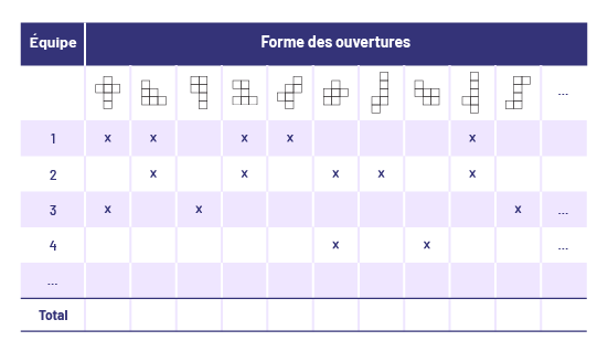 Afficher le tableau et demander à une équipe d’y placer la forme de l’une de leurs cinq ouvertures. Demander à toutes les équipes qui ont utilisé cette forme d’ouverture de tracer un X ou de placer un papillon adhésif sous celle-ci, dans la case de leur équipe y correspondant. Poursuivre cette démarche jusqu’à ce que les cinq ouvertures de toutes les équipes soient répertoriées dans le tableau. Faire le total du nombre d’utilisations de chaque ouverture.