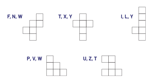 - que ces derniers sont généralement appelés les « pentacubes plats » et peuvent, en raison de leur forme, être associés un à un aux 12 pentominos (voir l’annexe Les 12 pentominos) et aux lettres F, I, L, N, P, T, U, V, W, X, Y et Z.