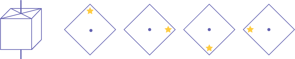cube est placé sur un axe. Une étoile est visible sur la vue d’en haut à un des coins. L’étoile change de position
