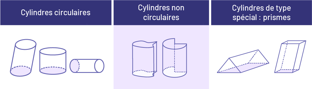 Note : Si la base d’un cylindre est circulaire, il s’agit d’un cylindre à base circulaire (ou cylindre circulaire). Si la base d’un cylindre est un polygone, le cylindre est également un prisme.